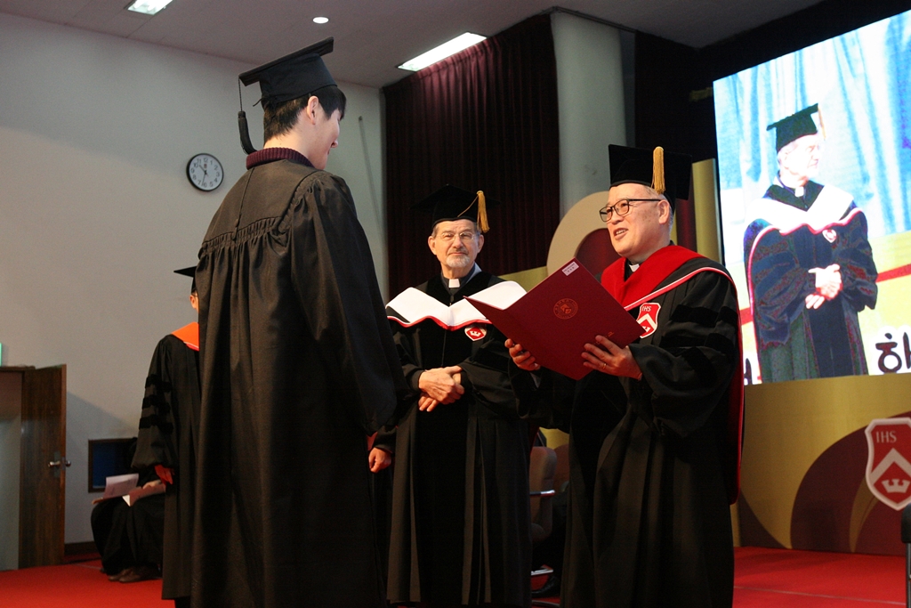 국민의례와 애국가 제창이 끝나고 박병관 교목처장이 “졸업생들이 인간 사회 공동선을 실현하고, 참사람이 되도록 도와주소서”라고 기도했습니다. 김균(78 영문) 교학부총장은 졸업생 학사 보고를 통해 학사 1072명, 석사 638명, 박사 55명 등 총 1765명이 학위를 받게 됐다고 알렸습니다.