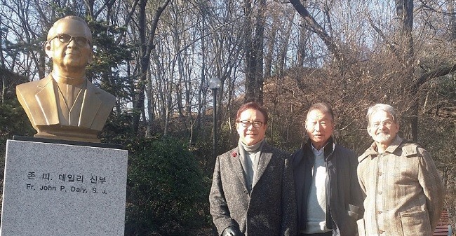 면담을 마친 이들은 로욜라 동산 옆에 건립된 데일리 총장 신부 동상을 찾았습니다. 박 동문은 동상을 어루만지며 “신부님, 저 왔습니다. 안녕하셨습니까?”라고 인사했습니다. 연배가 비슷한 이들은 각자 데일리 신부와의 오랜 인연을 언급하며 반갑게 담소했습니다. 친히 안내를 맡아준 재단이사장에게 감사인사를 전하는 한편, 겨울 볕이 따사로운 동상 앞에서 기념 촬영했습니다.