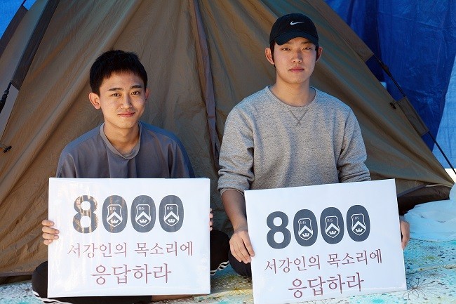 총학생회가 이사회 정상화를 위해 움직이고 있습니다. 9월 12일 열린 이사회 간담회 후 19일 임시 전체학생총회를 열어 ‘이사회 정상화 약속 요구의 건’을 가결시켰습니다. 이에 따라 20일 오후 11시부터 중앙운영위원회를 ‘이사회 정상화를 위한 비상대책위원회’로 전환하고, 21일부터 ‘8000 서강인의 목소리에 응답하라’는 이름으로 서명 운동을 시작했습니다. 또한 장희웅(13 컴퓨터, 사진 오른쪽) 총학생회장과 서혁진(14 아트 앤 테크놀로지, 사진 왼쪽) 지식융합학부 학생회장은 21일 0시부터 재단 개혁을 촉구하는 단식농성에 돌입했습니다. 본관 앞 국기게양대 앞에 천막을 치고 단식 농성하고 있는 장희웅 총학생회장을 만났습니다.