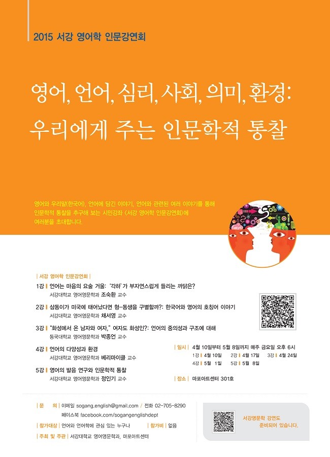 모교 영문과가 4월 10일 부터 5월 8일까지 매주 금요일 오후 6시 마포아트센터 301호에서 '2015 서강 영어학 인문강연회'를 개최합니다. 언어와 언어학에 관심 있는 동문 여러분들의 많은 관심과 참여 부탁드리며, 자세한 내용은 아래 링크를 클릭해 주십시오.