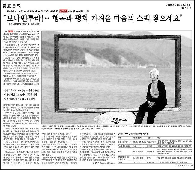 유시찬 前이사장 신부의 인터뷰가 동아일보 4월 24일자에 크게 실렸습니다. 지난 4월 5일 에세이집 <나는 지금 어디에 서 있는가>를 펴낸 유 신부는 이번 인터뷰에서 뒤늦게 신부가 된 과정과 가족 이야기 등을 풀어놓았습니다.