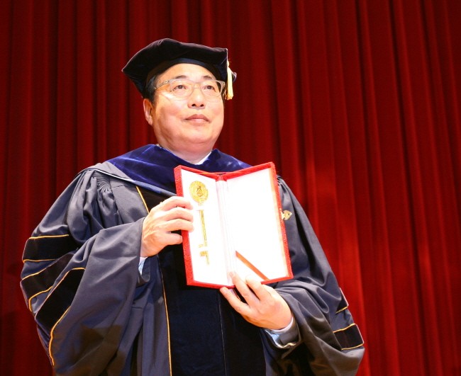 <이종욱(66 사학, 사진 왼쪽) 총장이 교기를 전달하는 장면>