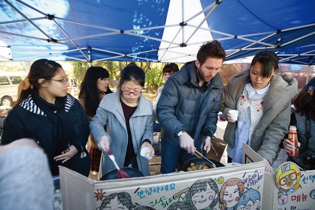 참석자들은 국적에 따라 중국식 고기햄버거와 닭 요리, 태국 월남쌈과 스프처럼 생긴 팍텅갱부앗, 스페인식 상그리아와 폴보론 과자, 프랑스 민속요리 크레이프, 일본식 야키도리와 버터 감자, 이탈리아식 핫초코 등을 즉석에서 조리했습니다. 능숙한 한국어로 “맛있으니 먹고 가세요”라고 호객한 덕분인지 대부분 음식장터는 재료가 일찌감치 떨어져 매진 사례를 이뤘습니다.