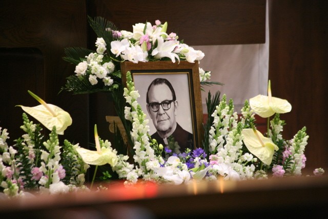 추모미사에 참여한 추모객들이 故존P.데일리 신부님 영정사진에 헌화하고 있다. 사진 앞줄 서 있는 추모객은 이종욱(66 사학) 총장.