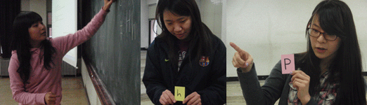 <청소노동자들을 위한 '영어강좌'에서 교사를 맡은 서강대 학생들. 좌로부터