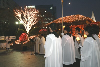 조현철 교목처장이 주례를 맡고 교내 피아트 성가대가 노래하는 가운데, 추운 날씨에도 불구하고 이종욱 총장을 비롯한 80여 명의 교직원과 재학생이 참석했다. 성탄구유에 아기 예수 인형을 내려놓고 주변에 성수를 뿌리는 예식이 진행됐다.