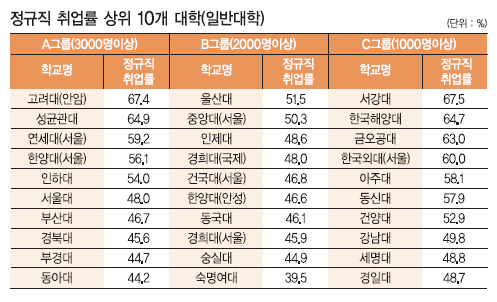 교육과학기술부는 전국 365개 대학의 졸업생 취업률 집계결과를 ‘대학 알리미(www.academyinfo.go.kr)’와 각 대학 홈페이지에 공개했습니다. 교과부는 다만, 졸업생 규모에 따라 대학을 3부류로 나눠 △3000명 이상을 A그룹 △2000~3000명을 B그룹 △1000~2000명을 C그룹으로 구획을 지어 발표했습니다. 모교는 졸업생이 1700여명이므로 C그룹에 속했습니다.