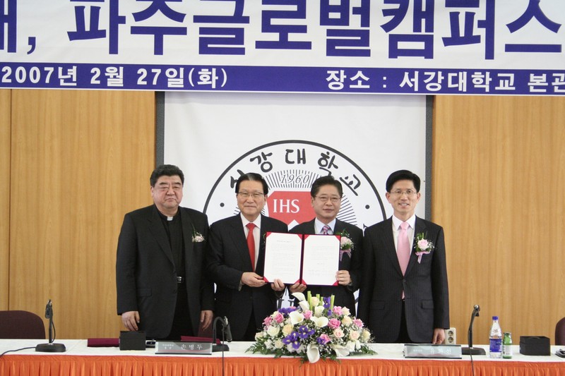 우리학교가 경기도 파주에 글로벌캠퍼스를 건립한다. 손병두 총장과 유화선 파주시장은 27일 오후4시 본관 4층 회의실에서 서강대 파주 글로벌캠퍼스 건립을 위한 양해각서(MOU)를 체결했다. 이날 양해각서 체결식에는 박홍 이사장과 김문수 경기도지사도 함께 했다.
