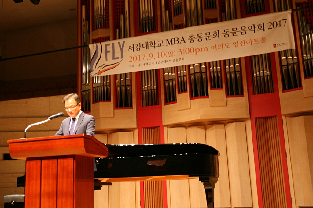 이윽고 음악회는 오후 4시 소프라노 박현주, 윤선경, 테너 김충희, 베이스 권순동 등 성악가들이 ‘오쏠레미오’를 부르며 막이 올랐습니다. 오프닝 공연 이후 김슬아(04 중문) 가톨릭평화방송 아나운서가 사회를 맡아 행사를 진행했고, 홍광헌(82 경영) 경영전문대학원장은 축사했습니다. 이승도 MBA 동문회장은 “음악회를 준비하면서 사무국 직원들과 함께 5000여 명에 달하는 동문 모두에게 연락을 취했다”라며 “음악회가 동문 현황 파악과 회장단 및 사무국을 강화하는 계기도 됐다”라고 말했습니다. 그러면서 이 회장은 “조직 강화, 홈페이지 개편, 모바일앱 개발, 스마트 오피스 구축 등을 해냈으니, 동문들은 세미나/등산/골프/와인/마케팅 모임 등 다양한 동문회 활동에 참여하면서 엄청난 MBA 동문 인프라를 적극 활용하기 바란다”라고 당부하며 ‘명품 서강 MBA’ 구호를 외쳤습니다.