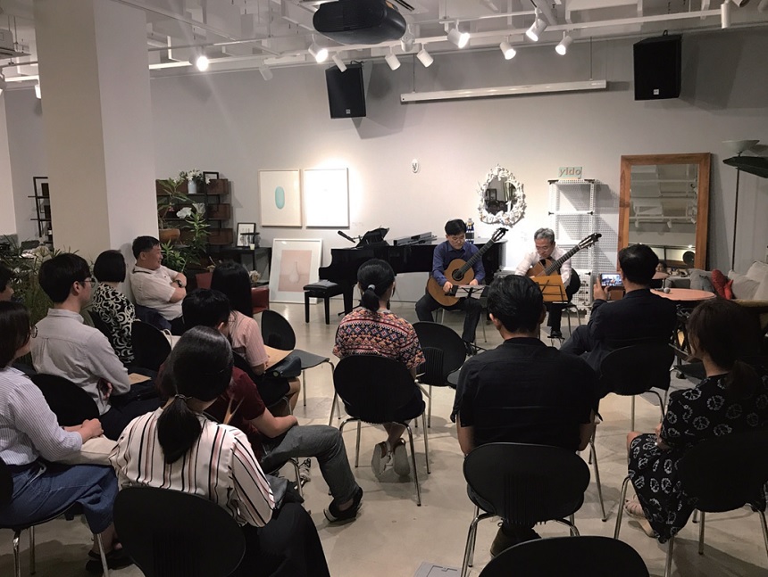 이기중(79 경제, 1기) 전남대 교수가 제안하고, 김영근(83 경제, 5기) 동문의 후원과 이원균(85 경영, 7기) 동문의 지원 덕분에 김성균 후원을 위한 연주 모임이 기획됐습니다. 기금 약정에 돌입한 동문들은 7월 7일 오후 7시 서울 가회동 이도갤러리에서 열린 후원 연주회장으로도 발길을 서둘렀습니다. 이날 김장열(80 영문, 2기), 이병학(84 컴퓨터, 6기), 김용진(89 화학, 11기) 동문도 김성균 동문과 함께 연주회 주자로 나섰습니다. 품격 있는 공간에서 기타 선율이 울려 퍼졌습니다.