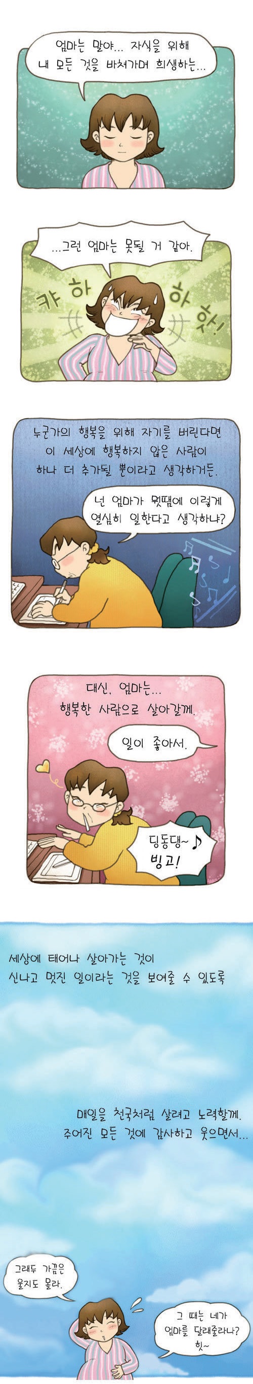 “또래 작가들에 비해 정식 데뷔가 너무 늦었지만, 그 덕분에 연재할 기회가 주어진 자체가 감사하고 작업하는 매 순간이 행복하고 보람 있어요. 만화 작업이 정말 좋답니다. 육아 만화를 오래 그린 덕분에 제 작품을 오래 지켜봐 준 팬들이 있는데, 그 분들 덕분에 포기하지 않고 계속할 수 있는 것 같습니다. 좋은 작품으로 보답하고 싶어요. 제 만화에 응원과 공감을 보내주는 모든 분들과의 인연이 소중하기 때문에, 고마운 분들께 매주 작은 선물을 만들어 보내는 마음으로 작업하고 있습니다.”