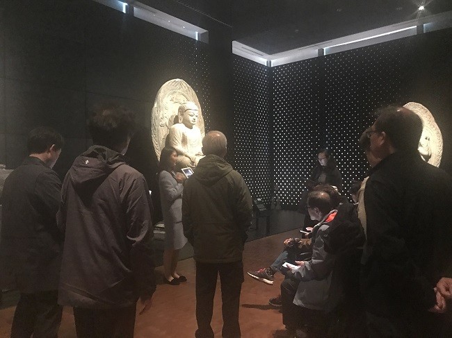 부 행사로 마련된 스마트 관람은 ‘불교미술로 보는 우리문화’를 주제로 전문학예사의 해설을 들으며 유물을 관람했습니다. 상에 드러난 육계(머리 정수리 위로 높이 솟은 모습)와 나발(부드럽게 말려있는 머리카락) 변천사를 통해 시대와 지역에 따라 부처님 모습이 다르게 형상화되었음을 알 수 있었습니다. 불상의 손갖춤에 따라 각 부처가 맡은 역할이 달라진다는 내용도 전해졌습니다. 2부인 ‘조선실’ 관람은 파란 곤룡포를 입은 태조의 어진을 보면서 시작했습니다. 참석자들은 성리학을 통치 이념으로 삼은 조선이 유교 국가로 형성, 발전, 쇠퇴하는 과정을 살폈습니다. 이후 동문들은 박물관 3층 전통찻집 ‘사유’에 모여 담소하고, 추첨을 통해 정훈(70 신방)-김해옥(70 문) 부부와 홍석범(75 사학) 동문 부부에게 기념품을 증정했습니다.