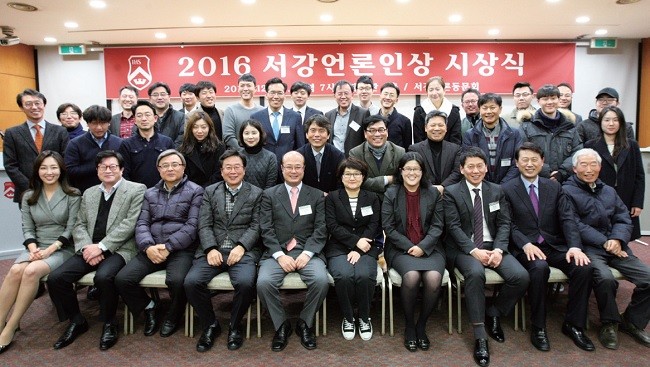 서강언론동문회(회장 77 정외 성한용)가 마련한 2016 서강언론인상 시상식이 2016년 12월 14일 오후 7시 모교 마태오관 9층 리셉션홀에서 열렸습니다. 매년 송년의 밤 형태로 대규모 연회를 개최해왔던 것과 달리 올해는 동문 언론인 50여 명이 참석한 가운데 시상식을 위한 자리로 꾸몄습니다. 이에 대해 성한용 서언회장은 “집행부 회의를 두 차례 열고 토의해보니 나라도 학교도 어수선하기에 우리끼리 소박한 행사를 치르자는 데 의견이 모였다”라고 참석자들에 설명했습니다.
