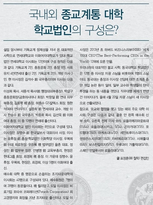 설립 당시부터 기독교계 정체성을 지녀 온 대표적인 사학으로 연세대학교와 이화여자대학교가 있다. 학교법인 연세대학교 이사회는 12인이며 구성 원칙은 다음과 같다. 기독교계 2인, 총동문회 2인, 총장 1인, 사회유지 4인(연세대 출신 2인, 기독교계 2인), 개방 이사 3인. 현 이사장은 김석수 前 국무총리이며 이사는 다음과 같다.