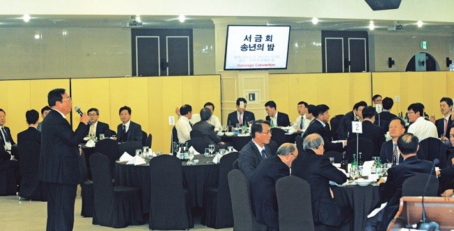 참석자들이 갈비탕으로 마련된 저녁식사를 즐기며 서로의 근황을 묻는 동안 유기풍 총장은 ‘서강의 미래를 위해서’라고 건배 제의했습니다. 송년회 초대 손님으로 참석해 자리를 빛낸 부좌현(77 철학) 국회의원은 “현재 학부 출신 현역 동문 국회의원이 저밖에 없다”라며 “학교 도울 일 있으면 적극 돕겠다”라고 인사했습니다. 이어 정연대(71 수학) 코스콤 사장은 “주관과 주체성 있는 자랑스러운 서금회가 되자”라고 건배 제의했고, 김정택 이사장은 “마음으로 소통하며 화기애애한 서금회가 자랑스럽다”라고 축배를 이었습니다. 서금회는 언제나처럼 이날 행사비를 고학번 동문이 십시일반 추렴했고, 참가자들로부터 받은 회비는 동문장학회 장학금과 모교 발전기금으로 기탁하기로 했습니다.