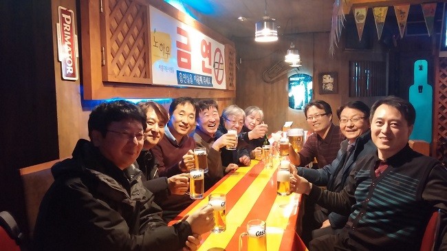 삼겹살로 저녁식사를 마친 뒤 인근 호프집으로 모임을 이은 자리에서 최창호(82) 동문이 “동문회 결속을 위해서라도 재학생 장학금 마련에 나서면 좋겠다”라고 건의하자 이기헌(76) 동문은 “76학번 국문과 장학금이 동문장학회를 통해 전달되고 있고, 국문과동문회에 기금도 있으니 확대해볼만 하다”라고 동의했습니다.