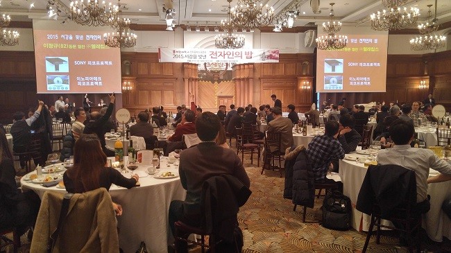 전자공학과 동문회(회장 77 류영렬)가 2015년 12월 14일 오후 7시 강남구 논현동 임피리얼 팰리스 호텔에서 ‘2015 서강을 빛낸 전자인의 밤’ 행사를 개최했습니다. 120여 명이 참석한 이번 행사에서 류영렬 전자공학과 동문회장은 “우리 동문들이 희망찬 2016년을 준비하고 있음을 믿는다”라며 “오늘 이 자리가 모교 사랑, 학과 사랑, 선후배 사랑을 느끼는 기회가 되었으면 한다”라고 인사했습니다. 김덕용(76) 총동문회장은 “오늘은 한 명의 전자공학과 동문 자격으로 참석했다”라며 “최근 모교가 발전의 기로에 서 있는데, 항상 서강 발전에 앞서 왔던 전자과 동문들이 이번에도 힘을 보탰으면 한다”라고 당부했습니다. 유기풍 총장은 “서강 발전이라는 일념으로 많은 도움을 청했는데, 그때마다 따뜻하게 받아 주신 전자공학과 동문께 감사 드린다”라며 “‘위기는 또 다른 기회다’라는 말처럼, 앞으로도 서강 발전에 최선을 다하겠다”라고 말했습니다.