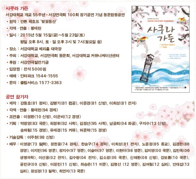 100회 공연 ‘사쿠라 가든’은 사실주의 희곡의 대가 안톤 체호프의 마지막 희곡 ‘벚꽃 동산’을 한국적으로 재해석한 작품입니다. 연출은 뮤지컬 ‘빌리 엘리어트’와 연극 ‘그와 그녀의 목요일’을 연출한 황재헌(94 경제) 동문이 맡았습니다.