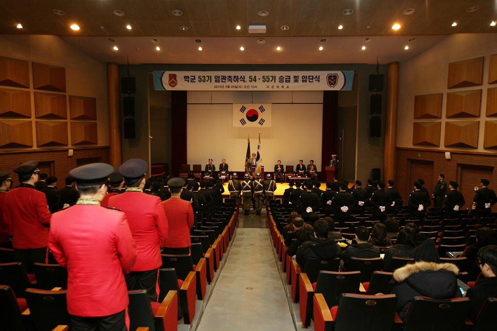학군사관(이하 ROTC) 제53기 임관식과 승급(54기) 및 입단(55기)을 기념하는 행사가 2월 25일 오전 10시 이냐시오관 강당에서 열렸습니다. 이날 임관하는 19명과 2~3학년 후보생 및 학부모 등 100여 명이 참석했습니다.
