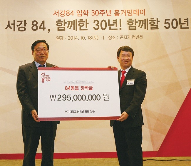 김정택(71 철학) 이사장은 “철학과 동문 선배로서 여러분이 무척 반갑다”라며 “사람을 살리는 참사람으로 살아가길 바란다”라고 당부했고, 유기풍 총장은 “84년도에 조교수로 서강에 부임한 명예 84학번으로서 동기 여러분들께서 모교 재창조 프로젝트에 많이 동참해달라”라고 말했습니다. 이어 김진영(76 전자) 총동문회 수석부회장은 자녀 혼사로 인해 김덕용 총동문회장께서 참석하지 못했다고 양해를 구한 뒤 “홈커밍 이후에도 소속 학과를 뛰어 넘어 ‘서강 가족’이라는 소속감을 바탕으로 서로 친하게 지내시라”라고 축사했습니다. 이어 송상근 위원장이 유기풍 총장에게 84학번이 십시일반 모은 장학금 2억 9500만 원을 전달했습니다.