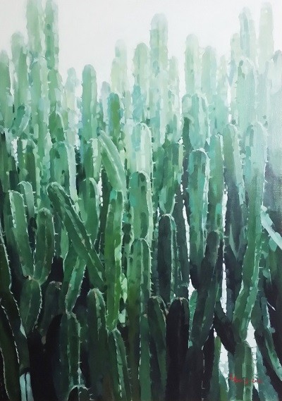 선인장의 그린색과 거친 생명력에 끌려 작년부터 다양한 종류의 선인장을 캔버스에 담아보았다. 작업을 할수록 그린 컬러가 주는 시각적 편안함과 가시가 뿜어내는 텐션이 대조를 이루는 선인장의 매력에 빠져 지내온 시간이었다. 이 작품은 선인장 시리즈의 마지막 작품으로 수직 구도가 주는 힘과 그린컬러의 생명력, 가시에서 느껴지는 거칠음으로 선인장을 표현해 보았다.