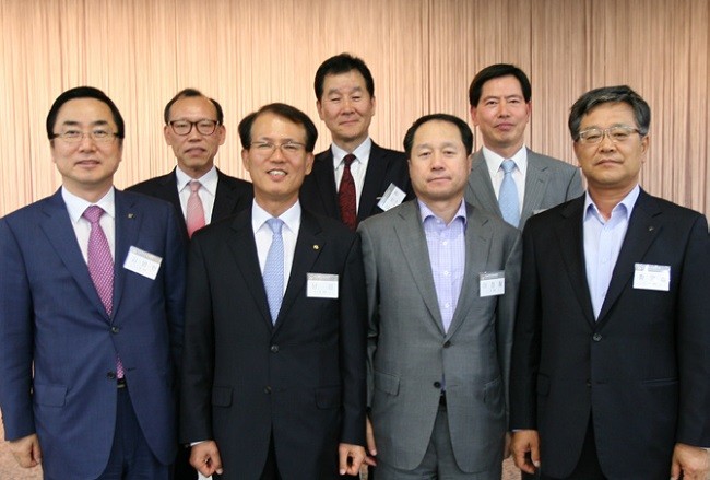 <맨 위 사진 앞줄 왼쪽부터 서강금융포럼 김병헌(76 경영) 보험권 대표, 남인(76 경제) 회장, 이정철(76 무역) 금융투자권 대표, 황영섭(77 경영) 감사. 사진 뒷줄 왼쪽부터 전병호(78 정외) 은행권 사무국장, 김서현(80 경영) 보험권 사무국장, 마진락(79 경영) 금융투자권 사무국장>