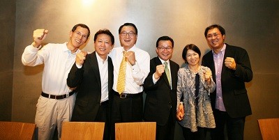 <산학협력기업 블루카이트(주) 출범에 힘 보탠 동문들. 위 사진 왼쪽부터 김상수(81 경제), 김진영(76 전자), 김덕용(76 전자), 장흥순(78 전자), 박민재(81 경영), 최휘영(83 영문) 동문. 아래 사진은 왼쪽부터 이상웅(77 경영), 김태주(81 전자), 임원현(84 경영) 동문>