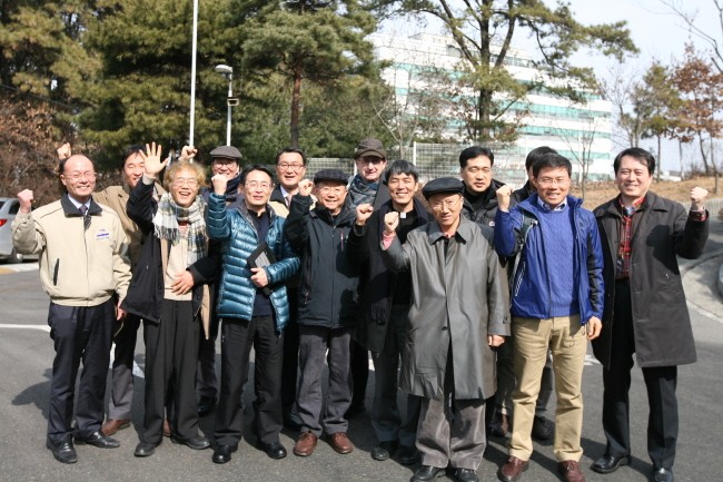 <㈜KMW 동탄공장에서 LED 조명 장비를 설명하는 김덕용(사진 맨 왼쪽) 총동문회장>