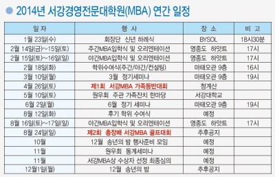경영전문대학원동문회(회장 32기 인묘환)가 3월 10일 오후 7시 마태오관 9층에서 정기 세미나를 개최한다. 참석을 원하는 MBA 동문은 MBA동문회 사무국으로 미리 참가 신청해야한다. MBA동문회는 올해 4월 26일(토) 청계산으로 제1회 서강MBA 가족등반대회를 진행할 예정이며, 8월 24일(일) 제2회 총장배 서강MBA 골프대회를 개최할 계획이다.