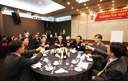 경영전문대학원(이하 MBA) 동 문 회 주 최 ‘2013 서강 MBA 송년의 밤’ 행사가 12월 2일 저녁 6시 30분 서울 역삼동 삼정호텔에서 열렸다. 유기풍(SCAMP 15기) 총장과 박영석 MBA 원장을 비롯해 동문 160여 명이 참석한 가운데 1부 사회는 장성철(32기) 동문이 맡았다. 환영사에서 인묘환(32기) MBA 동문회장은 “모교와 총동문회, MBA 동문회가 한 팀을 이뤄 움직일 때 학교와 동문 발전이 가능하다”라며 “비즈 메카가 되는 MBA 동문 네트워크를 만들기 위해 노력하겠다”라고 말했다.