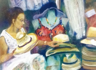 금년 여름 여행 중 프랑스 남부국경 근처 한 가게에서 소박한 모습의 가게 주인이 옷가지와 모자를 팔고 있었다. 굳건히 자신의 공간을 지키며 삶을 영위하는 모습에서 우리들 삶의 모습 또한 그러하리란 생각이 들어서 따듯한 눈길로 사진 한 장 찍었다. 그것이 그림이 될 줄이야…! 이 여인은 모자를 정리하며 이리저리 옮기고 있다. 그 순간 이 여인에게 세상이란 마치 이 공간뿐인 듯하다.