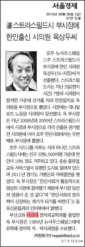 [서울경제] 호주 스트라스필드시 부시장에 한인출신 시의원 옥상두씨