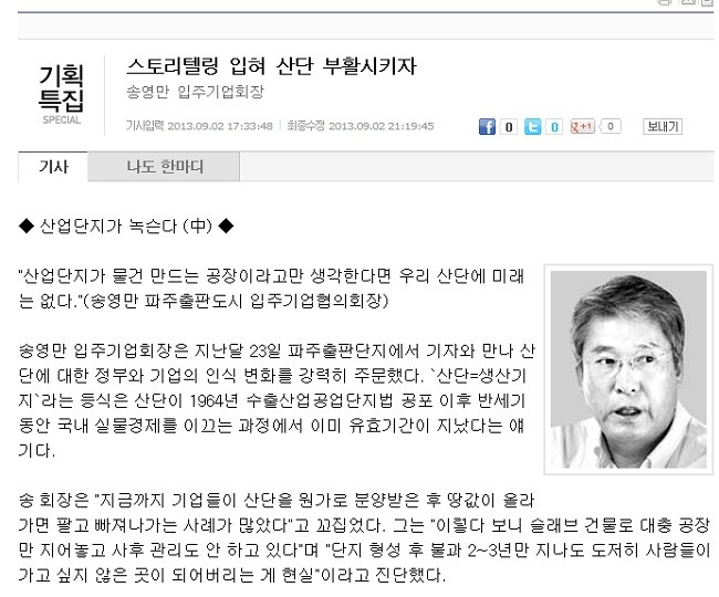 송영만(74 정외) 동문의 인터뷰가 매일경제에 실렸습니다. 현재 파주출판도시 입주기업협의회장을 맡고 있는 송 동문은 인터뷰를 통해 "산업단지가
