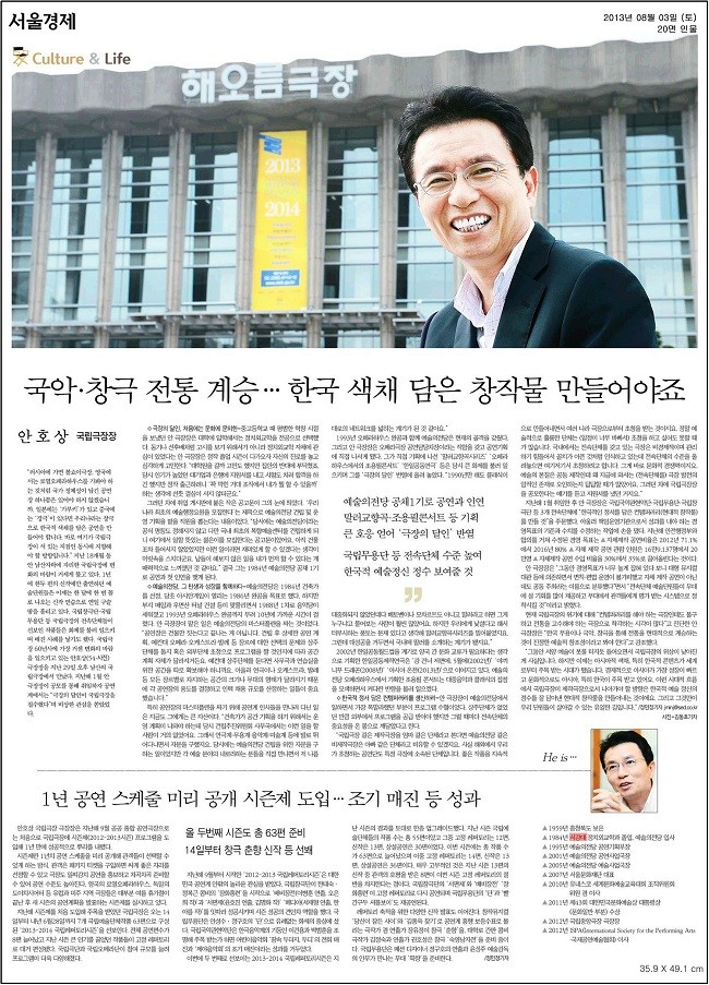 국립극장 극장장을 맡고 있는 안호상(79 정외) 동문의 인터뷰가 서울경제에 실렸습니다. 모교 졸업 후 예술의 전당 공채 1기로 공연계에