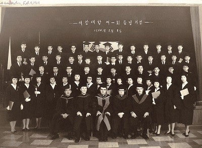 서강대학교 총동문회는 1964년 2월 6일 목요일 오후 4시에 결성됐다. 1회 졸업식(2월 8일<사진>)을 이틀 앞둔 날이었다. 날씨는 연일 계속되던 추위가 한 풀 꺾인 영하 0.2도. 60학번이자 1회 졸업생 전원인 60명은 C관 라운지에 모여 역사적인 첫 동문회를 결성했다.