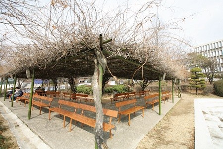 ‘등나무 벤치’라고 하면 어디인지 금방 떠오르지 않는 동문도 있을 법하다. 학교 정문에서 오른쪽 길로 잠시 오르다 체육관 쪽 길로 방향을 틀면, 길 오른쪽에 테니스코트가 있고 왼쪽 위에 등나무가 무성한 벤치들이 자리 잡고 있다.