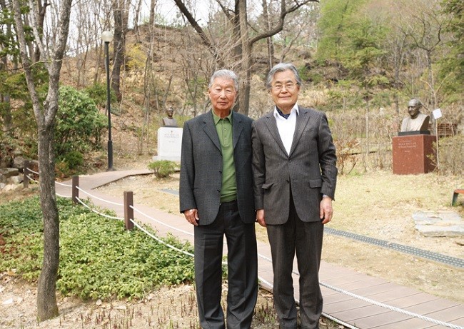 이번 제막식은 박정철(60 사학, 위 사진 왼쪽) ‘故존P.데일리 초대 총장 동상 건립 및 장학금 모금 추진위원회 (이하 위원회)’ 위원장이 유명렬(65 경제, 위 사진 오른쪽) 한국진행위원장과 함께 4월 8일 학교를 방문해 흉상 부지와 기념식에 대해 학교 측과 최종 협의한 끝에 이뤄졌습니다.