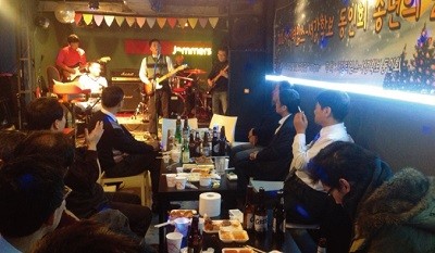 서강타임스 · 학보 동인회가 12월 21일 오후 7시 홍익대 정문 부근의 라이브클럽 ‘재머스’를 통째로 빌려, 밴드공연과 바비큐 파티가 어우러지는 송년회를 열었다. 문재철(77 신방), 고성학(78 정외) 동문을 비롯한 1970~2000년대 학번의 동문 30여명이 참석한 가운데 주연(酒筵)은 밤늦도록 이어졌다. 사회를 맡은 이한기(87 사학) 동문은 참석자 자기소개 시간에서 마치 대선 TV토론을 진행하는 것처럼 능숙하게 진행했다. 각자 1분30초간 자기소개를 한 다음, 30초 동안 질문 받고나서 1분 동안 답변하는 상호토론을 이끌어냈다.