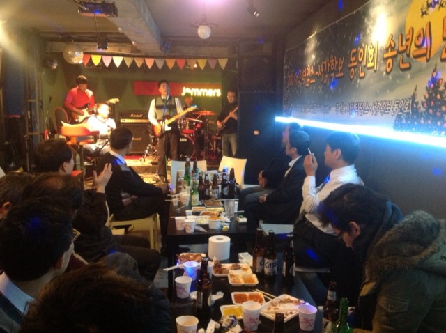 송년회의 하이라이트는, 몇몇 동인들이 멤버로 활약하는 5인조 밴드 두 팀의 라이브 공연이었습니다. 라이브 클럽인 만큼 코앞에서 그룹사운드의 하드 락 경연이 순식간에 펼쳐졌고, 생동하는 연주음이 귀청을 때렸습니다.