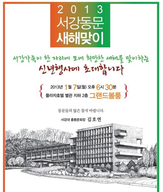 '2013 서강동문 새해맞이' 행사가 1월 7일 오후 6시 30분 플라자호텔 별관 지하 2층 그랜드볼룸에서 열립니다.