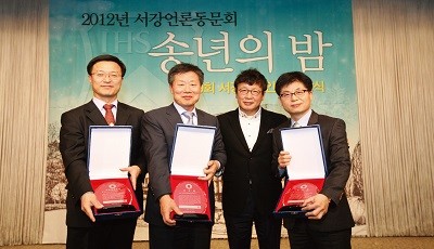 <사진 오른쪽부터 제9회 서강언론인상을 받은 김경호(79 정외), 최태환(74 정외) 서언회 회장, 공로상을 받은 고성학(78 정외), 윤종진(82 신방) 동문>