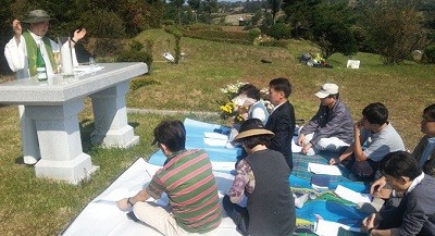 김정택 신부는 묘역에 마련된 야외 제대(祭臺)에서 미사를 집전했다. 김 신부는 강론에서 “높은 이혼율을 보이는 우리나라에서 결혼의 신성함을 깨달아 가정공동체의 가치가 회복되길 바란다”라고 말했다. 특히 김춘수 시인의 ‘꽃’을 낭송하면서 “하느님이 첫 번째 인간에게 아담이란 이름을 붙여주었듯이 인간 역시 자신을 둘러싼 주위 사물 하나하나에 이름을 붙여주는 마음가짐으로 자연과 교감하며 친화해야 한다”라고 말했다.