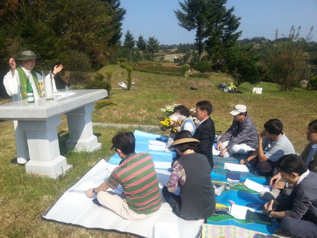김정택 신부는 묘역에 마련된 야외 제대(祭臺)에서 미사를 집전했습니다. 김 신부는 강론에서 “높은 이혼율을 보이는 우리나라에서 결혼의 신성함을 깨달아 가정공동체의 가치가 회복되길” 희망했습니다. 특히 김춘수 시인의 <꽃>을 낭송하면서 “하느님이 첫 번째 인간에게 아담이란 이름을 붙여주었듯이 인간 역시 자신을 둘러싼 주위 사물 하나하나에 이름을 붙여주는 마음가짐으로 자연과 교감하며 친화해야 한다”고 말했습니다.