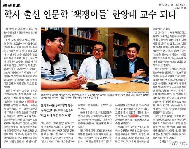 [조선일보] 학사 출신 인문학 '책쟁이들' 한양대 교수 되다
