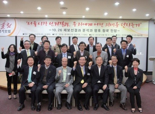 이번 모임은 재보궐선거 이후 한국 정치 지형과 전망에 대해 이현우(81 정외) 모교 정외과 교수가 발제하고 성한용(77 정외) 한겨레신문 정치부 선임기자가 토론하는 형식으로 자유롭게 진행됐습니다. 이 동문은 정치인이 아닌 시민단체 출신 박원순 시장 당선 의미와 안철수 현상에 대해 분석했고, 성 동문은 내년 정치 총선과 대선 전망에 대해 각각 발표했습니다. 재보궐선거 직후라 참석자들 대부분이 선거에 관심이 많았던 만큼, 이에 대한 질문이 계속됐습니다.