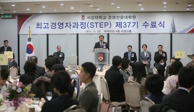 2011학년도 경영전문대학원 최고경영자과정(STEP) 제37기 수료식이 11월 22일 모교 마태오관 9층 리셉션홀에서 열렸다. 37기 원우들을 새로운 동문으로 맞이하는 수료식에는 이종대 STEP 총동우회장, 변세학 수석부회장, 류규선 재무부회장 등이 참석해 격려했다. 또, 유기풍 산학부총장, 조현철(77 전자) 교목처장, 민재형 경영전문대학원장, 전성률 STEP 주임교수, 박경도 STEP 간사교수 등을 비롯한 경영전문대학원 교수진이 참여해 자리를 빛냈다.