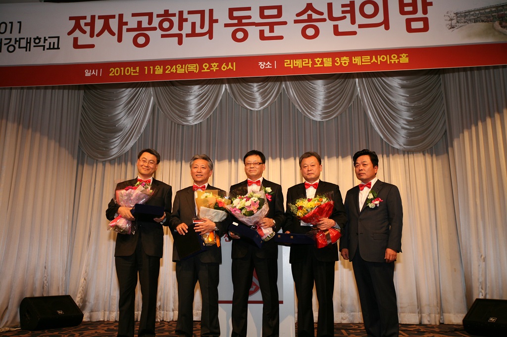 전자공학과 동문 송년의 밤 행사가 11월 24일 오후 6시 청담동 리베라호텔 3층 베르사이유홀에서 열렸습니다. 동문, 교수, 학교 관계자 등 200여 명이 참석한 가운데 마련된 행사는 전자공학과 동문회 임원들이 교표와 같은 색깔의 빨간색 나비 넥타이와 폴로 티셔츠를 드레스 코드로 착용한 덕분에 송년 분위기가 물씬 풍겼습니다. 특히, 전자공학과 재학생 도우미들이 사슴뿔 모양으로 머리띠까지 착용한 덕분에 크리스마스 파티를 치르는 듯했습니다.신재섭(81) 전자공학과 동문회 수석부회장이 사회를 맡아 진행한 송년회는 ‘전자인의 노래’를 합창하는 것으로 개회를 선언했습니다. 동문들은 학창 시절 기억을 더듬어 “지축을 박차고 포효하여라! 전자의 야망 젊은 기백을, 천지를 뒤흔드는 부르짖음아! 서강의 얼이 되어 메아리친다!”라는 가사의 노래를 힘차게 부르며 모처럼 만난 동문들과 마음을 모았습니다.
