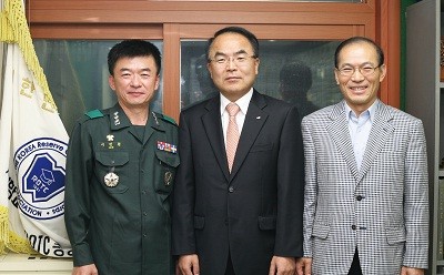 <(사진 왼쪽부터) 이명원 서강대학교 학생군사교육단장, 임수택(75 경영) 학생군사교육단 동문회장, 홍석범(75 사학) 학생군사교육단 동문회 사무총장>