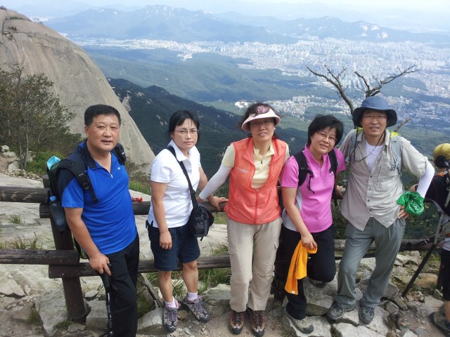 <백운대에 올라 인수봉과 서울도심을 배경으로 기념사진을 찍었습니다. 왼쪽부터 이범국(컴퓨터), 이창섭(국문), 마유미(사회), 박은아(국문), 박영숙(사학), 김병창(국문) 동문>