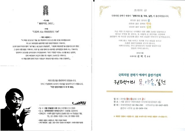 권택기 동문의 출판기념회는 9월 6일 오후 2시 광진구 어린이회관 무지개극장에서 열리며, 의원 생활 3년을 담은 에세이 '권택기의 꿈, 약속, 실천'의 출판을 기념하는 자리입니다. (사진 오른쪽 초대장 참조)